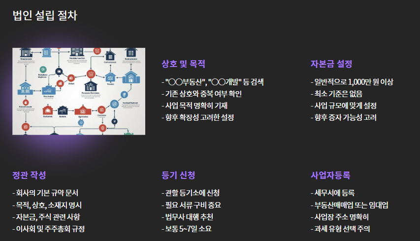 | ① 상호 및 목적 정하기 | "○○부동산", "○○개발" 등 유사 상호 검색 |