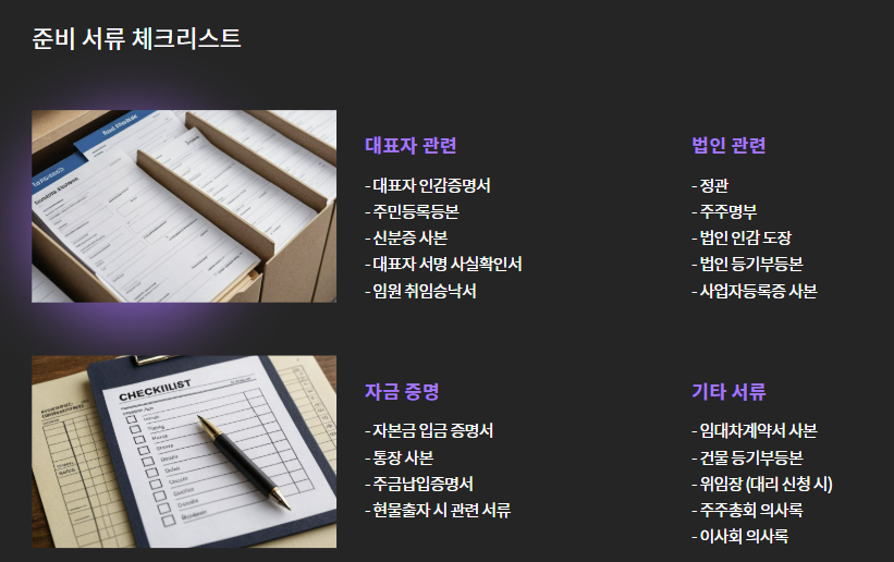 | ④ 등기서류 준비 | 설립등기 신청서, 정관, 인감 등 |