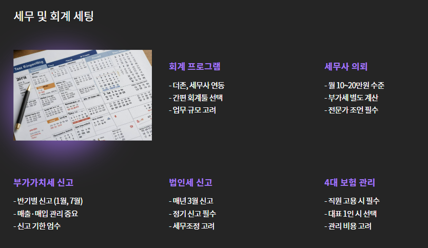 | ⑦ 세무 신고 세팅 | 법인 계좌 개설, 4대 보험 신고 등 병행 |