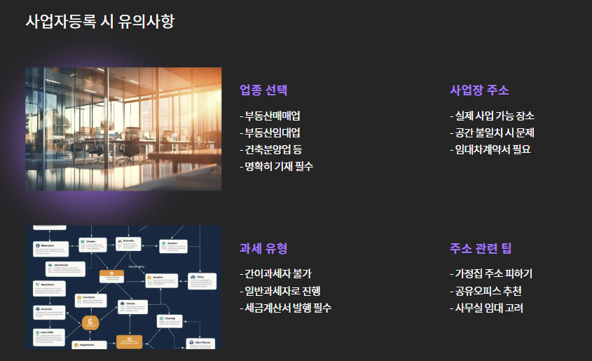 - 사업장 주소는 실제 사업 가능 장소여야 함 (공간 불일치 시 세무서 문제 발생)