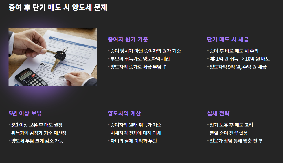 🧾 4. 증여 후 단기간 내에 팔면 ‘양도세 폭탄’ 맞을 수 있다