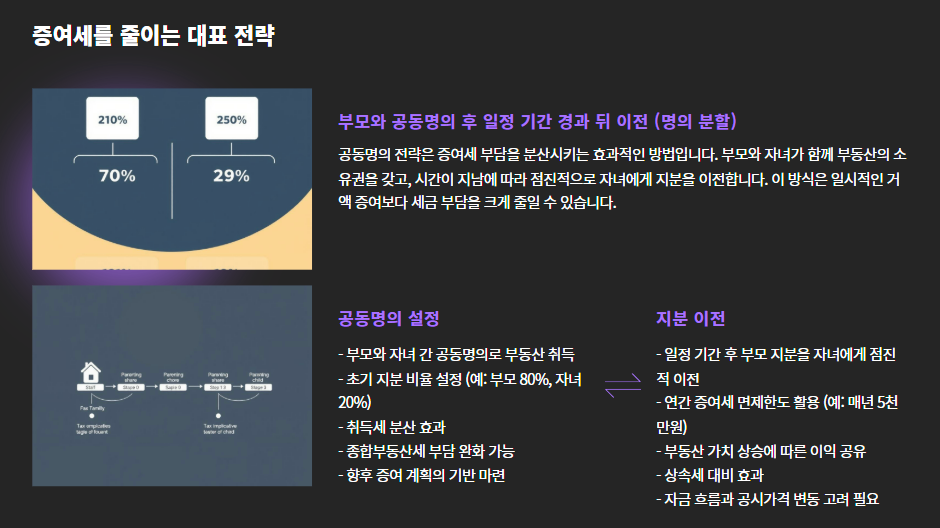 처음엔 부모·자녀 공동명의로 설정한 뒤, 몇 년 후 지분 이전을 통해 증여세 부담을 나눌 수 있음