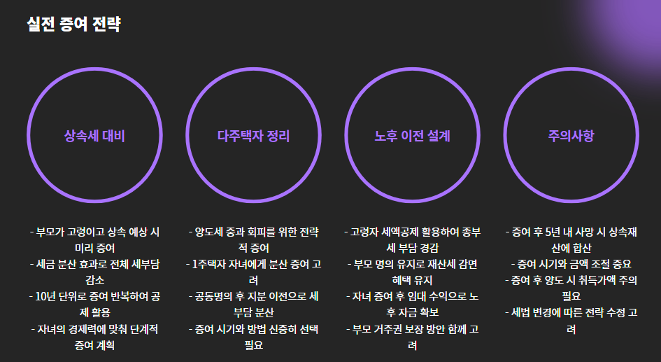 - 상속세 대비용: 부모가 고령이고, 향후 상속이 예상된다면 미리 증여하여 세금 분산