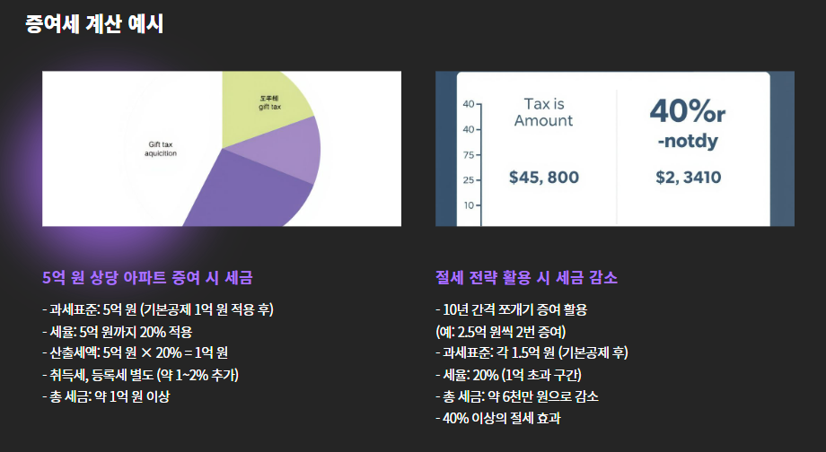 즉, 5억 원 상당의 아파트를 증여하면 → 약 1억 원 이상의 세금이 나올 수 있습니다.