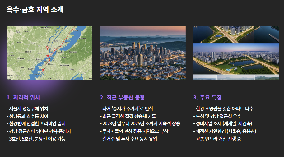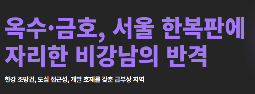 한남동과 성수동 사이에 위치한 이 지역은 한강 조망권, 도심 접근성, 개발 호재라는 삼박자를 갖춘 지역으로 재조명되고 있습니다.
