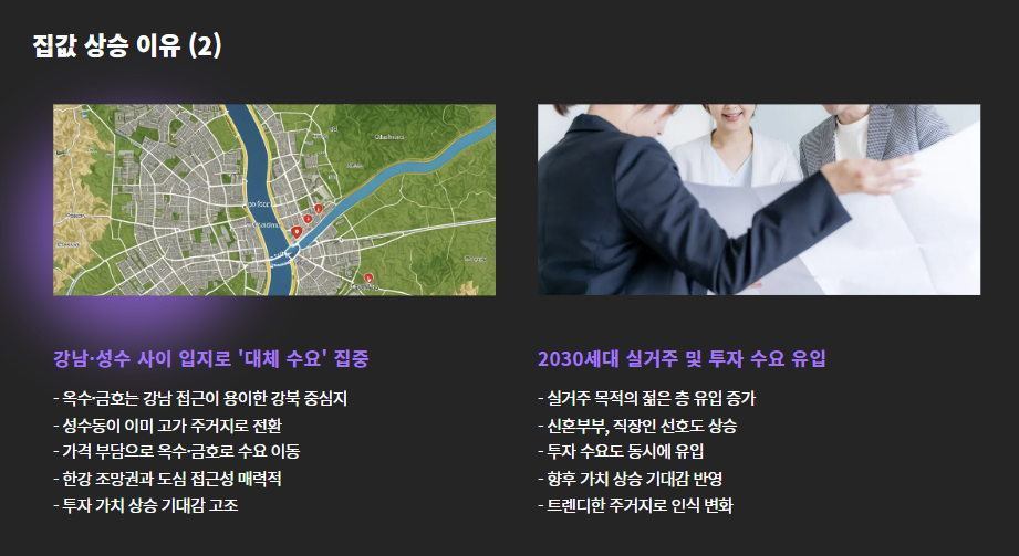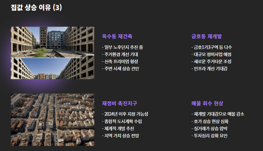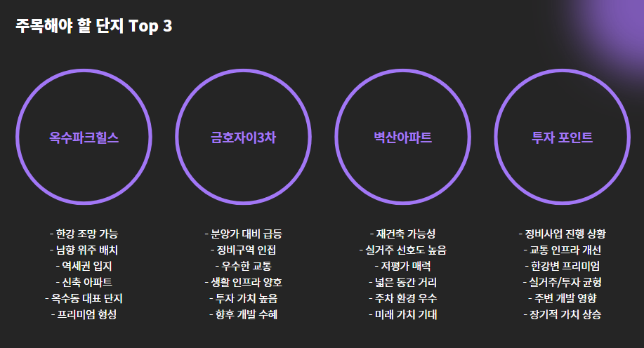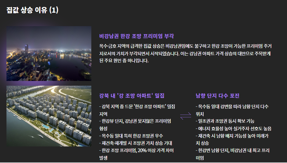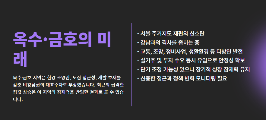 - 옆 동네인 성수동이 이미 고가 주거지로 전환되며, 가격 부담에 따라 옥수·금호로 수요 이동