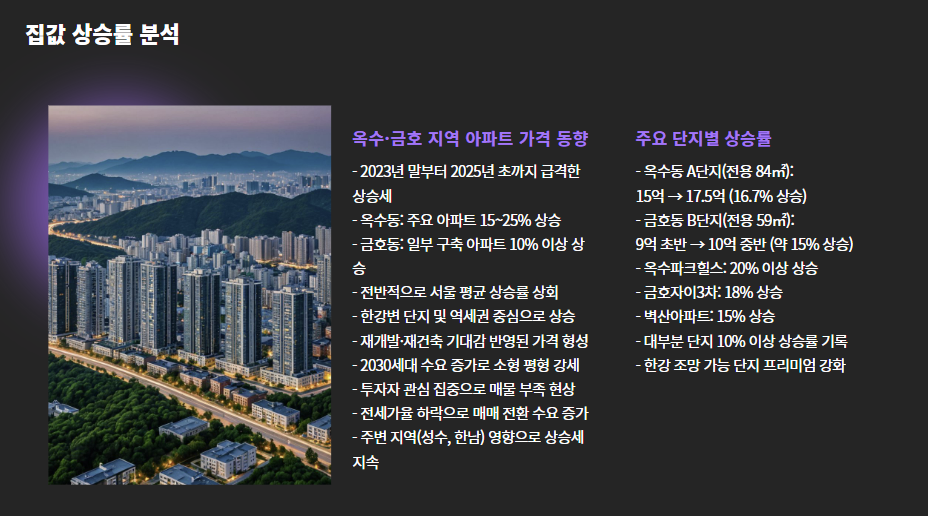 - 옥수동 주요 아파트 실거래가 기준 약 15~25% 상승