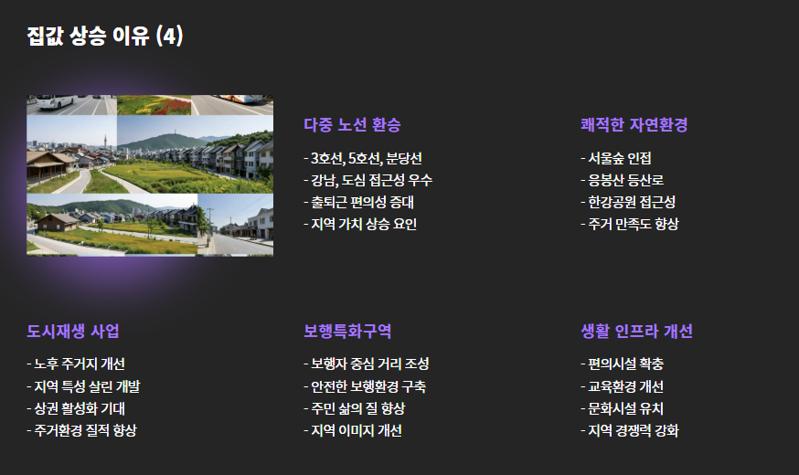 - 서울숲, 응봉산, 한강공원 등 쾌적한 자연환경