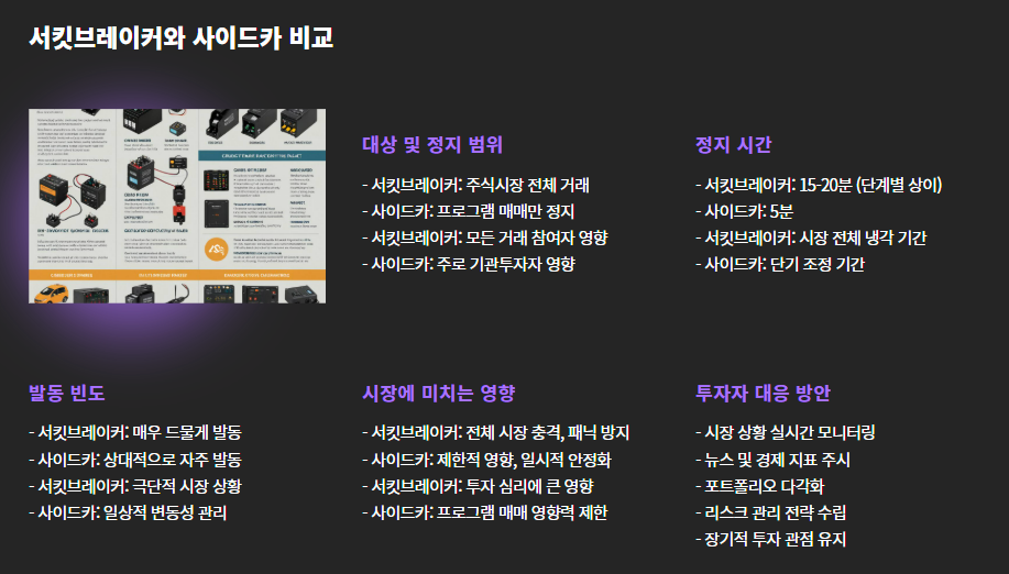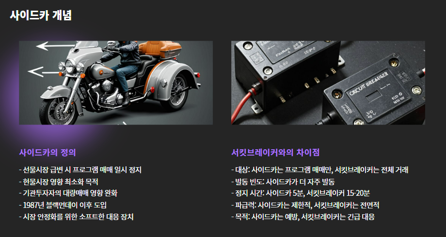 사이드카는 프로그램 매매만 일시 중지시키는 소프트한 대응 장치입니다.