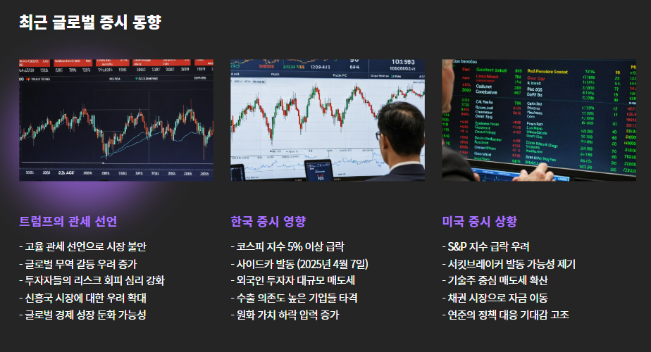 최근 글로벌 증시가 트럼프의 고율 관세 선언으로 흔들리고 있습니다.