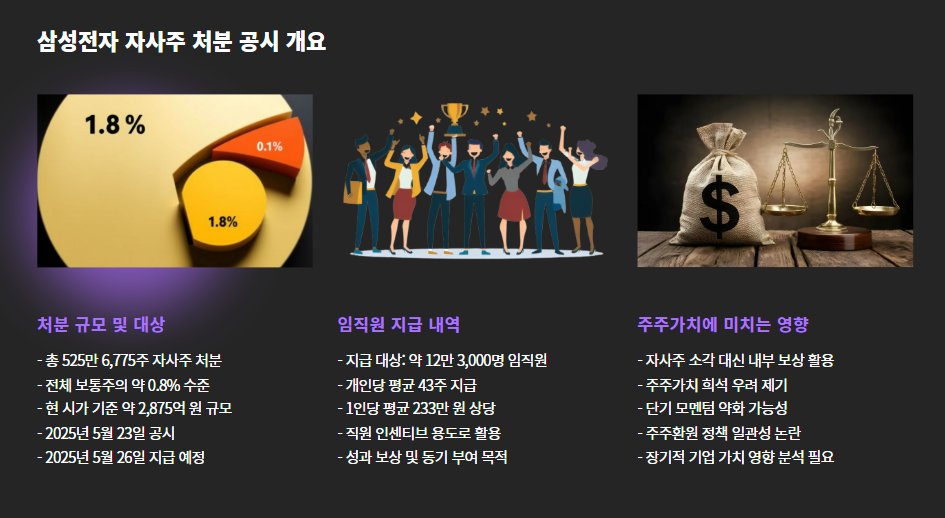 2025년 5월 23일, 삼성전자는 총 525만 6,775주의 자사주를 임직원에게 지급한다고 공시했습니다.