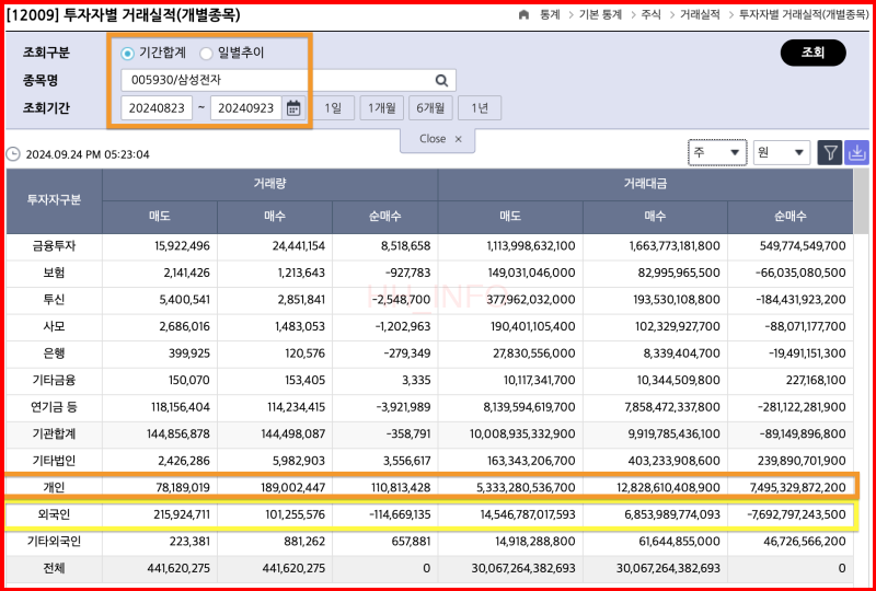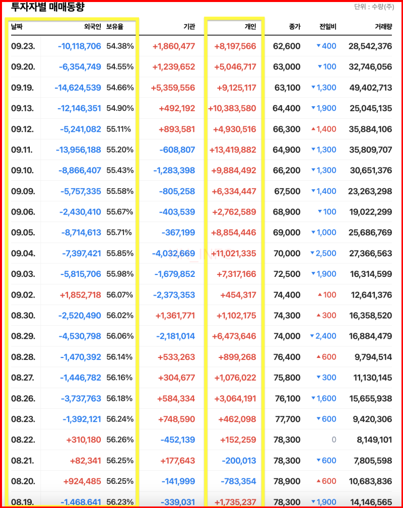외국인은 8월 23일 이후 꾸준히 삼성전자의 주식을 매도하고 있습니다. 반면 개인 투자자들은 외국인의 매도 물량을 계속해서 매수하고 있지만, 외국인의 지속적인 매도세로 주가는 더 이상 버티지 못하고 하락하고 있습니다. 외국인의 보유율은 한 달 사이에 56%에서 54%로 줄었으며, 이는 삼성전자의 시가총액이 91조원 가량 감소한 결과를 가져왔습니다.