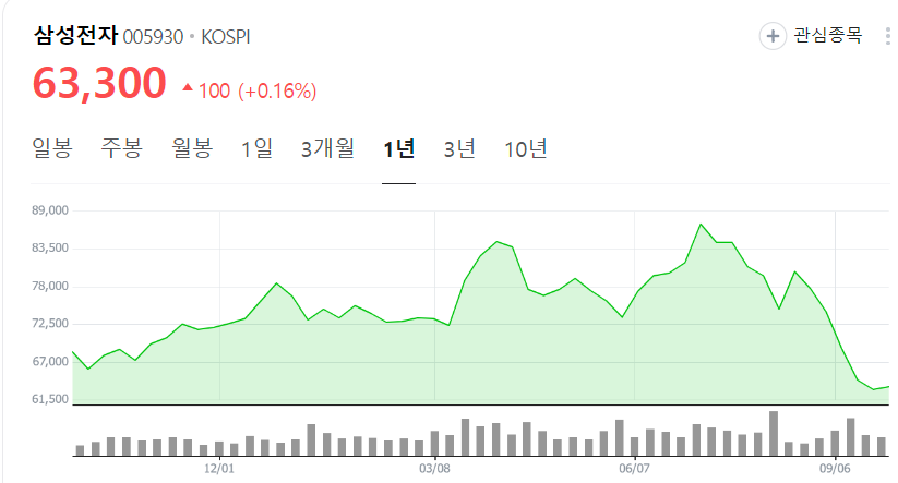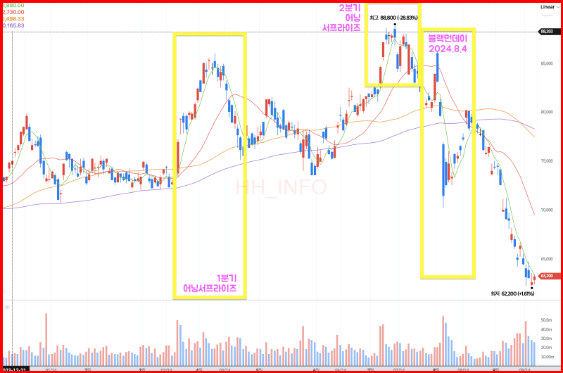 2024년 초부터 삼성전자의 주가는 7만원대 초반에서 시작하여 1분기와 2분기에 각각 어닝 서프라이즈를 기록하면서 상승세를 보였습니다. 1분기에는 85,000원, 2분기에는 88,800원까지 상승했으나, 곧바로 주가가 하락하며 다시 7만원대로 돌아왔습니다. 특히 8월 4일 이후 삼성전자의 주가는 큰 폭으로 하락하였고, 현재까지도 회복의 기미가 보이지 않고 있습니다.