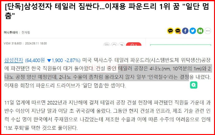 미국 텍사스에 건설 중이던 테일러 파운드리의 공사가 중단된 것도 주가 하락의 큰 요인 중 하나입니다. 이 공장은 4나노, 2나노 공정을 위한 핵심 시설이었으나, 2나노 공정의 수율 문제로 인력이 철수하면서 공사가 지연되고 있습니다. 이는 삼성전자가 반도체 제조 기술에서 경쟁력을 상실하고 있다는 신호로 받아들여지고 있습니다.