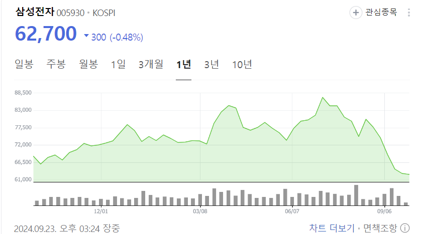 삼성전자는 2023년 7월에 52주 최고가인 88,800원을 기록하며 9만전자를 눈앞에 두고 있었으나, 현재는 62,000원대에 머물러 있습니다. 이는 **약 30%**에 달하는 하락으로, 투자자들 사이에서 위기감이 확산되고 있습니다.