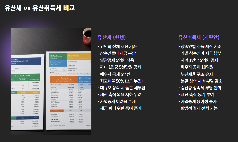 이게 무슨 말이냐고요? 간단히 말해, 상속세를 “유산세”에서 “유산취득세”로 바꾸겠다는 거예요.