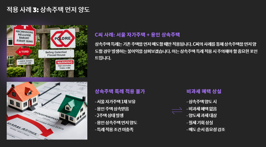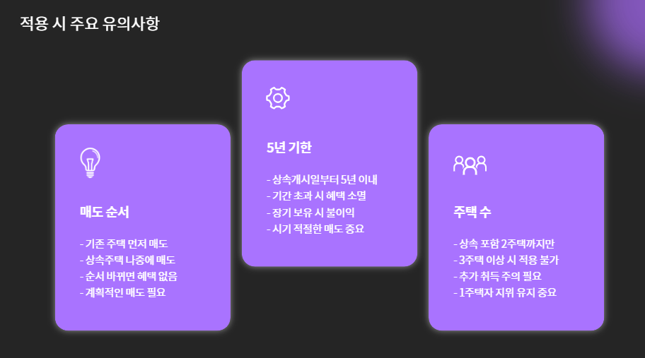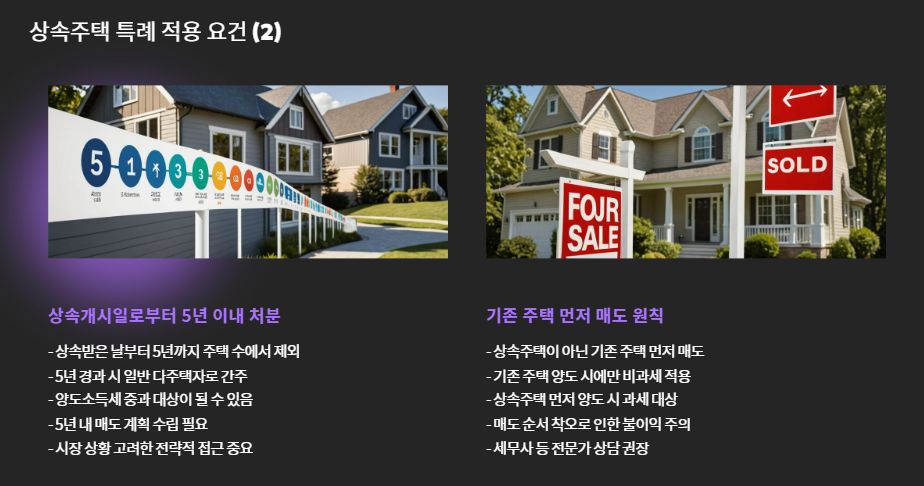 | ⑤ 기존 주택을 먼저 매도해야 함 | 상속주택 양도 시는 특례 적용 안 됨 (기존주택 양도 시만 해당) |
