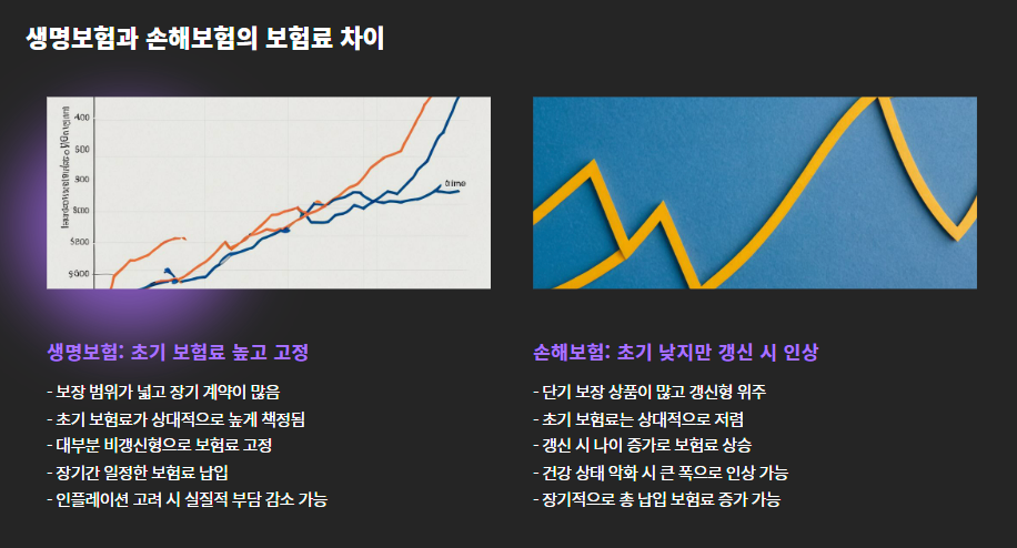 초기에 보험료가 비교적 높고 고정된 경우가 많습니다. - 손해보험은 단기 보장 + 갱신형 위주라