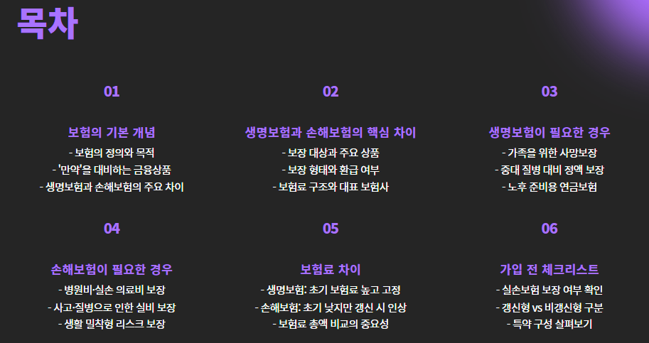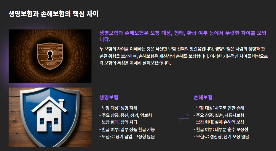 | 대표 보험사 | 삼성생명, 한화생명, 교보생명 등 | 현대해상, DB손보, 삼성화재, 메리츠화재 등 |
