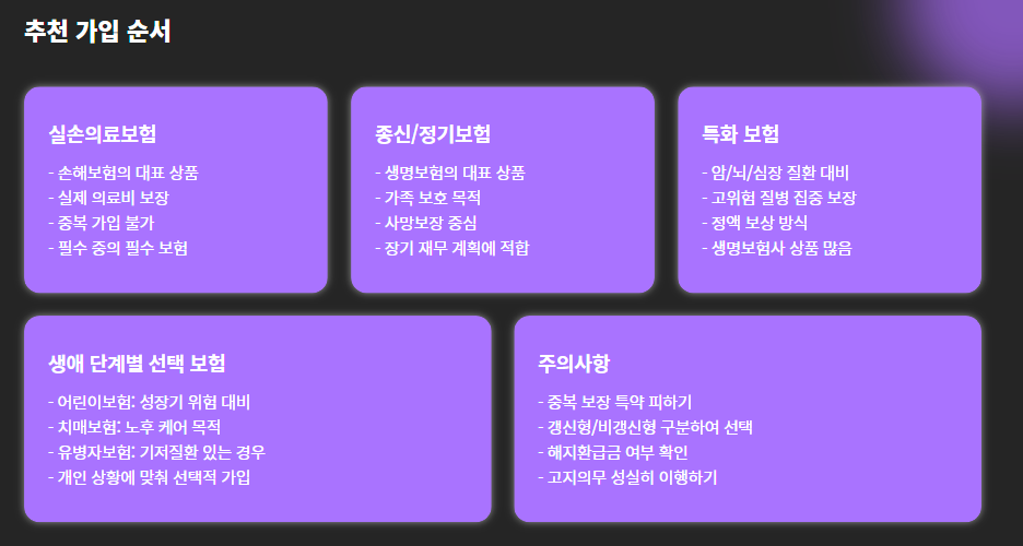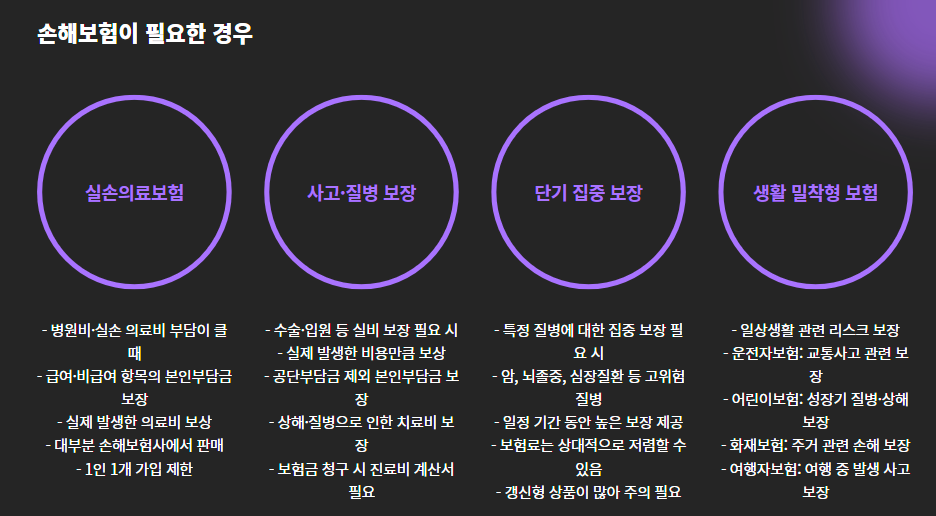 - 병원비·실손 의료비 부담이 클 때 (실손보험은 무조건 기본 탑재)