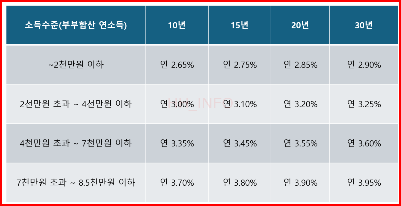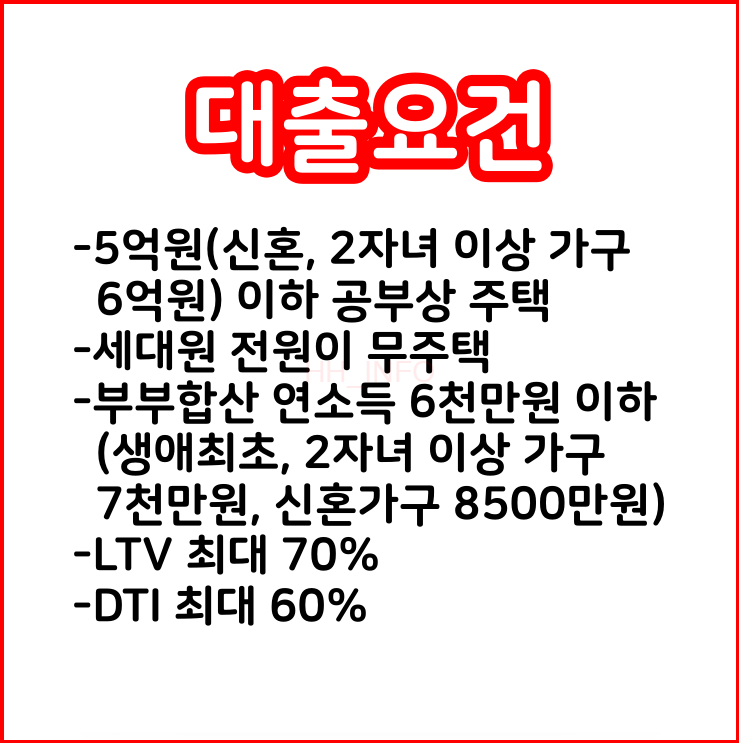- 소득 기준은 부부합산 연소득 6천만원 이하이고, 생애최초 주택구입자나 2자녀 이상 가구는 7천만원 이하, 신혼가구는 8,500만원 이하입니다.