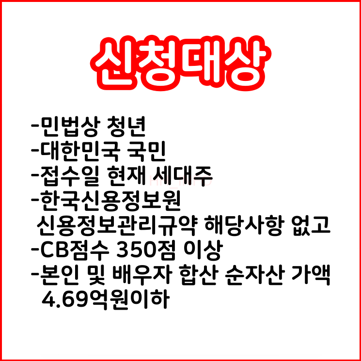 - NICE신용평가 CB점수 350점 이상, 순자산 4.69억원 이하인 경우 신청 가능합니다.