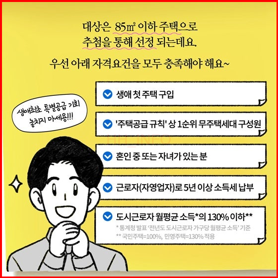 - 청약 자격: 전용 85m² 이하 주택에 대해 생애 처음 주택을 구입하는 무주택 세대 구성원으로, 5년 이상 근로 또는 자영업 소득세를 납부한 기혼자가 대상이 됩니다. 소득 기준이 대폭 완화되어 월평균 소득의 130%까지 확대되었습니다.