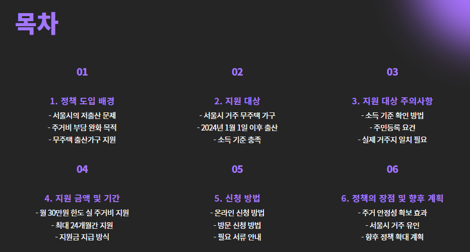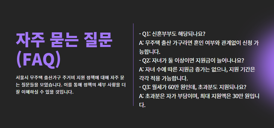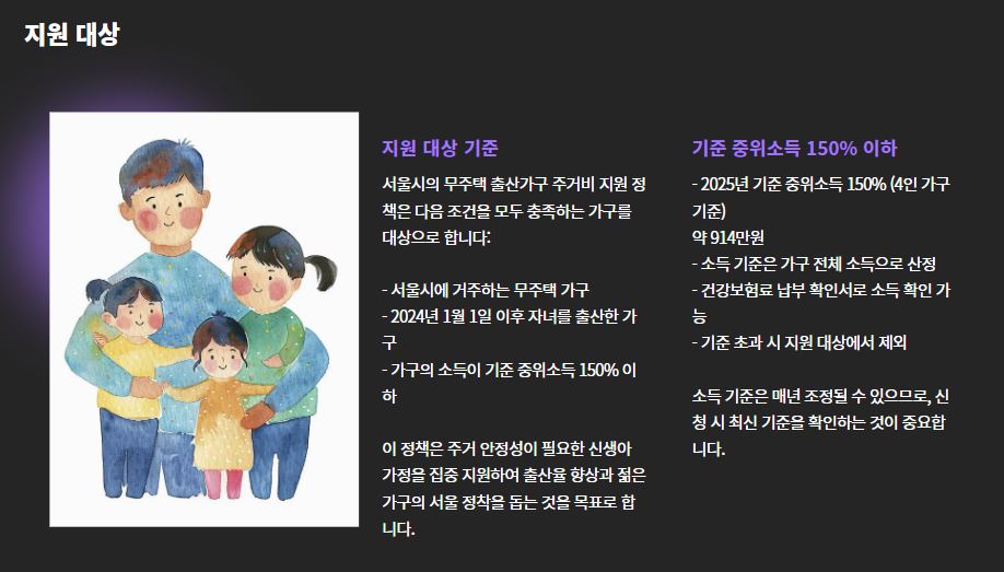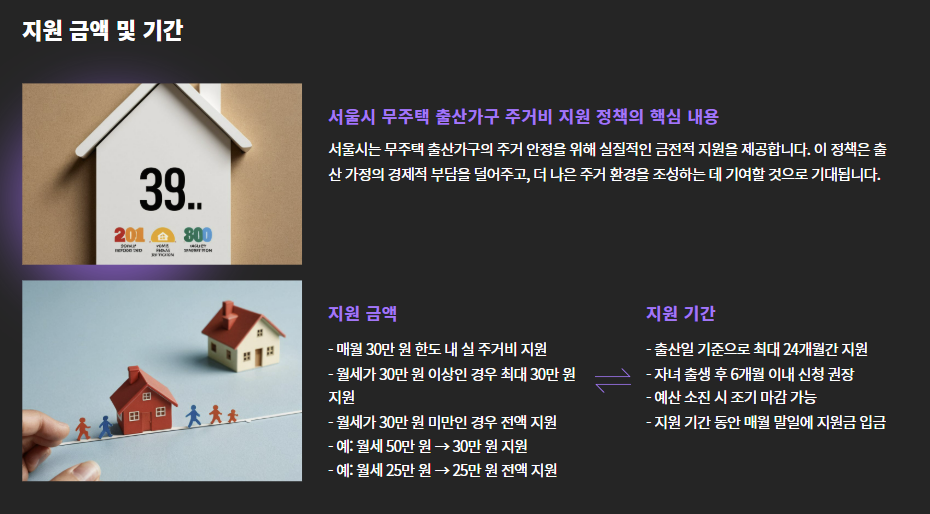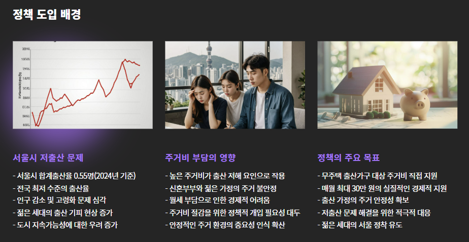 이에 서울시는 “아이를 낳는 것이 경제적 부담이 되지 않도록” 한다는 취지로, 무주택 출산가구에 매월 최대 30만 원의 주거비를 직접 지원하는 사업을 도입했습니다.