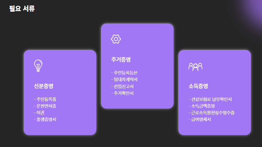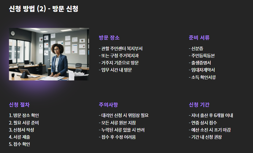 - 신분증, 주민등록등본, 출생증명서, 임대차계약서, 소득 확인서류 제출