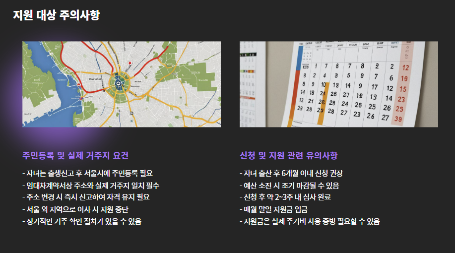 - 자녀가 출생신고 후 서울시에 주민등록 되어 있어야 함