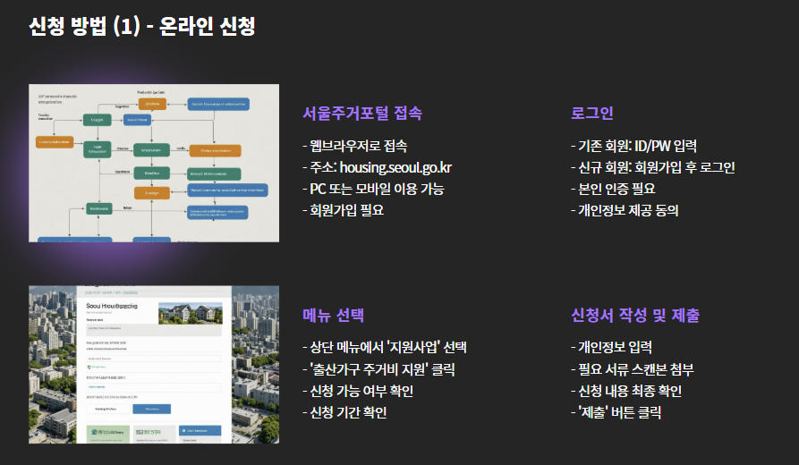 - 로그인 → 출산가구 주거비 지원 메뉴 선택 → 신청서 작성 및 서류 첨부