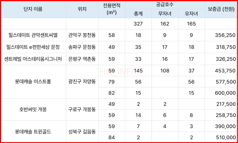 이번에 공급되는 미리내집은 총 6개 단지에서 327세대를 모집합니다. 봉천동, 자양동, 개봉동, 길음동, 문정동, 역촌동 등의 지역에 위치하고 있으며, 면적과 보증금은 다양하게 설정되어 있어, 다양한 신혼부부들의 주거 요구를 충족시킬 수 있습니다.