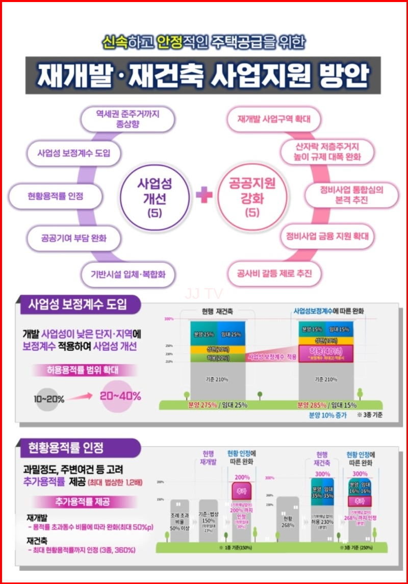 이번 발표된 재개발 지원 방안은 사업성 개선과 공공지원 등 두 가지 주요 분야로 나뉩니다. 이를 총 10종류의 세부 내용으로 구성되어 있습니다.