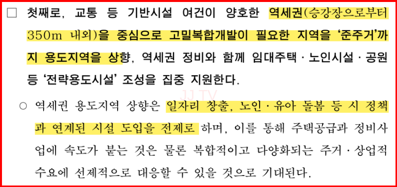 역세권의 용도지역을 '준주거'로 상향할 수 있게 됩니다. 또한, 일자리 창출, 노인·유아 돌봄 시설, 임대주택 등이 필수 조건으로 제시됩니다.