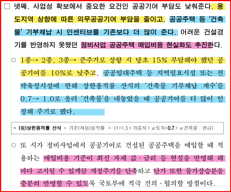이러한 조치로 공공기여 부담도 축소되며, 부담 해소를 통해 사업성을 높입니다.