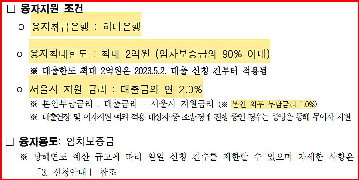 서울시는 임차보증금의 90%를 최대 2억원까지 대출할 수 있습니다. 대출금의 연 2.0% 금리를 지원하며, 본인 부담금리는 1.0%입니다. 이 모든 지원은 하나은행을 통해 이루어집니다.