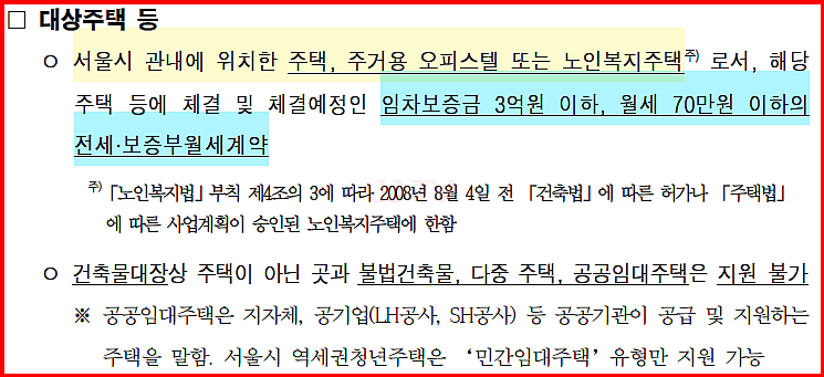 지원 대상 주택은 서울시 내에 위치한 주택, 주거용 오피스텔 또는 노인복지주택이며, 임차보증금은 3억원 이하이고 월세는 70만원 이하여야 합니다. 공공임대주택과 불법건축물, 다중주택은 지원 대상에서 제외됩니다.