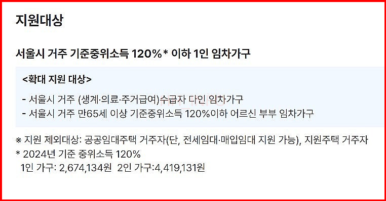 지원 대상은 서울에 거주하는 기준 중위소득 120% 이하의 1인 임차가구예요. 2024년 기준으로 월소득이 2,674,134원 이하이면 해당됩니다. 또한, 만 65세 이상 어르신 부부나 수급자 다인 임차가구도 지원 받을 수 있어요.