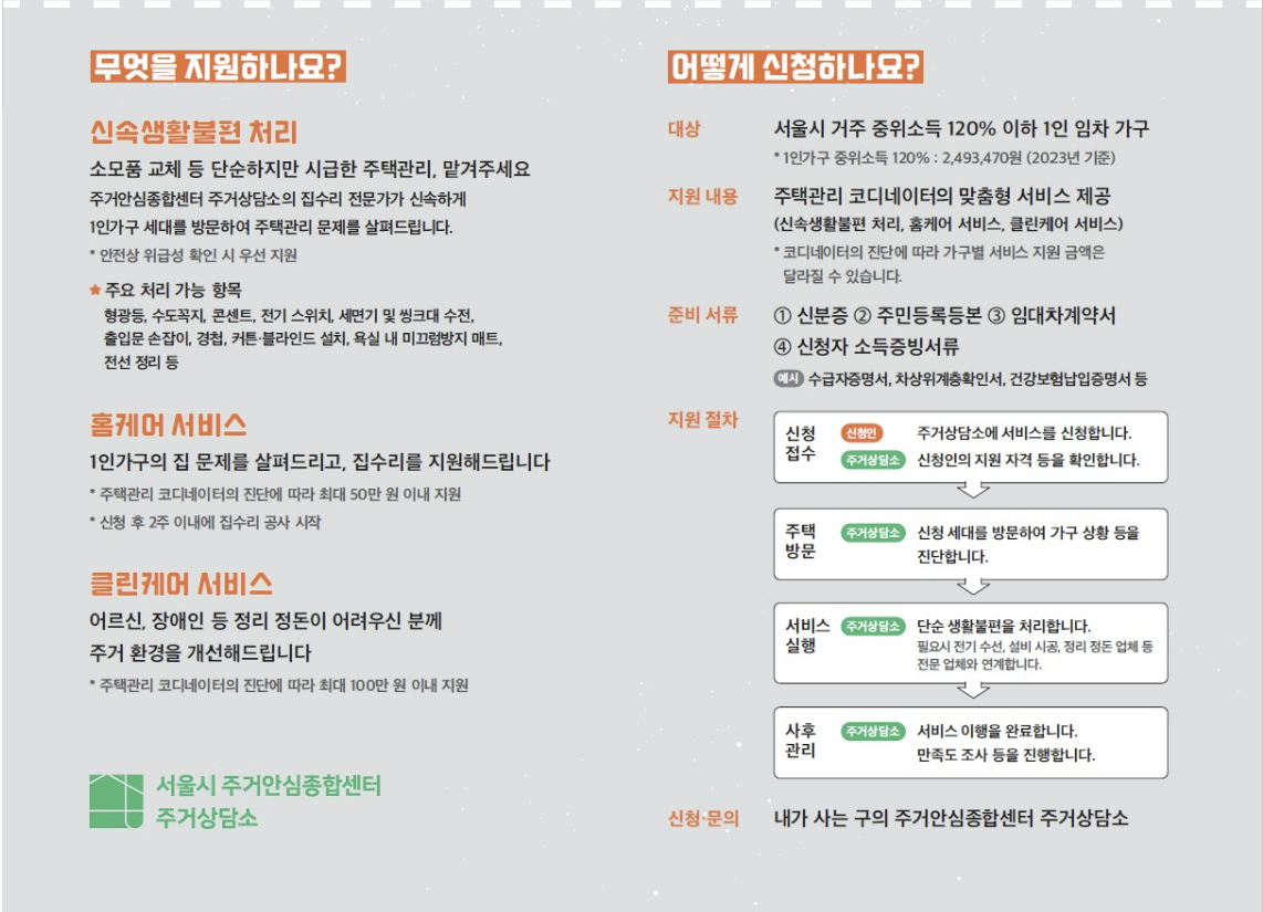 - 신청 방법: 관할 자치구 주거안심종합센터에서 신청할 수 있어요. 유선 연락은 주거안심지원반(02-2133-9578)으로 가능해요.