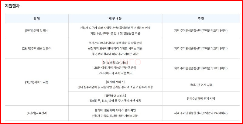 - 클린케어 서비스: 고령자, 장애가구 등을 위해 청소와 수납 정리 서비스를 제공해요. 가구당 최대 100만원까지 지원됩니다.
