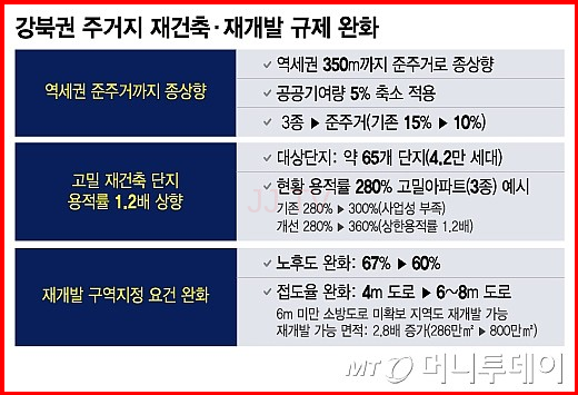 주요 지역으로는 상계, 중계, 월계, 번동, 창동, 방학, 신내, 성산 등이 주목되며, 이 지역의 재개발을 위한 규제완화가 예정되어 있습니다.