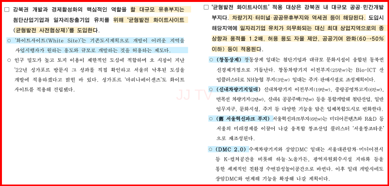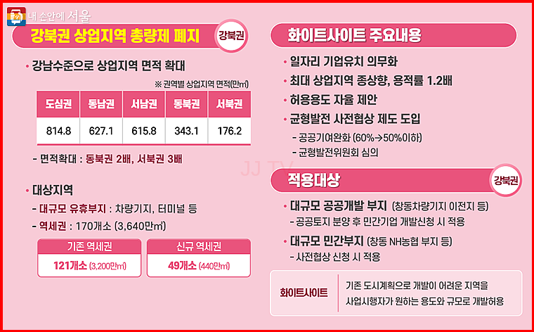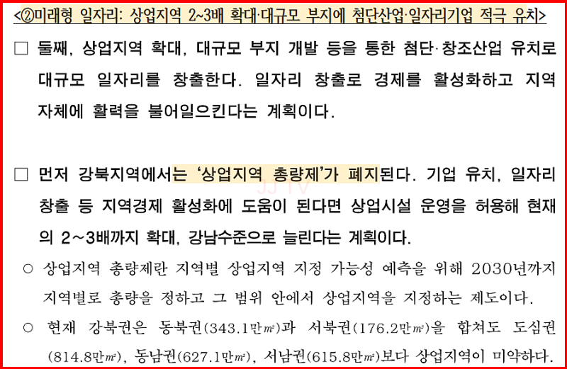 강북지역의 경제적 발전을 위해 '상업지역 총량제' 폐지와 화이트사이트 도입 등의 계획이 세워졌습니다.