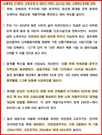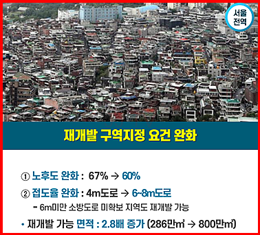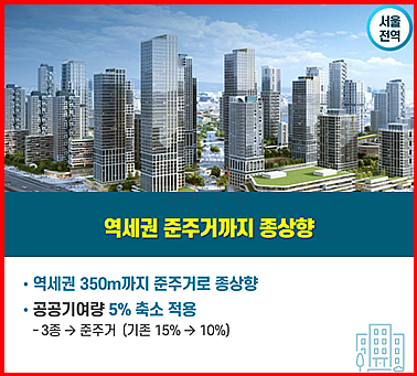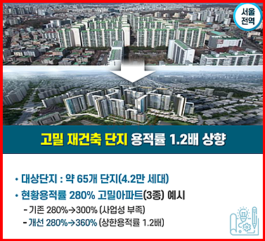 이를 위해 용적률 규제 개선, 저층주거지 재개발 규제완화, 상업지역 확대 등의 제도적 변화가 예고되어 있습니다.