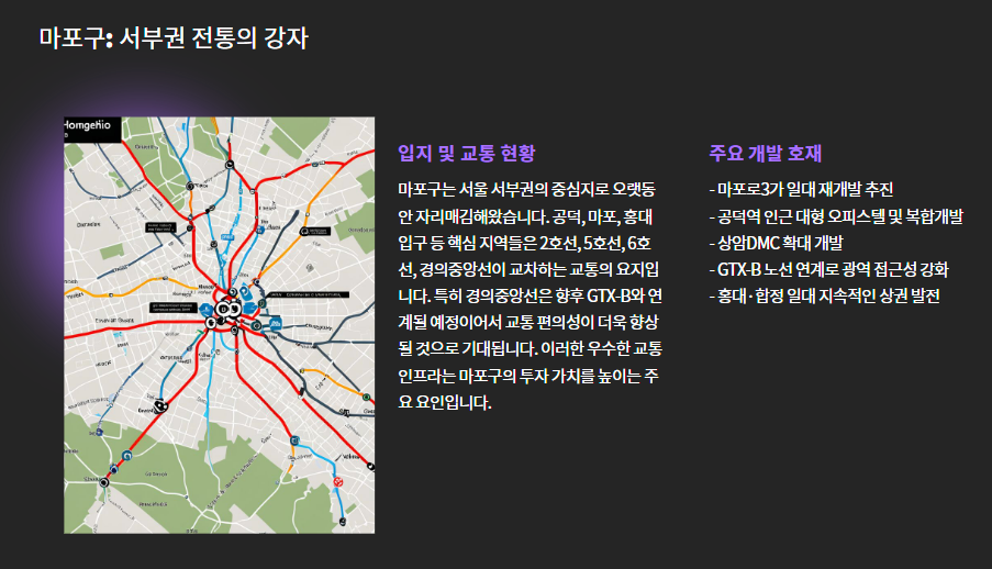 마포구는 오랜 시간 동안 서울 서부권에서 중심 역할을 해왔습니다. 특히 공덕, 마포, 홍대입구 등 핵심 지역들은 2호선, 5호선, 6호선, 경의중앙선이 교차하는 교통 요지입니다. 여기에 경의중앙선은 향후 GTX-B와의 연계가 예정되어 추가 호재가 기대됩니다.