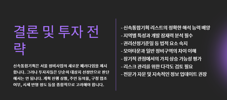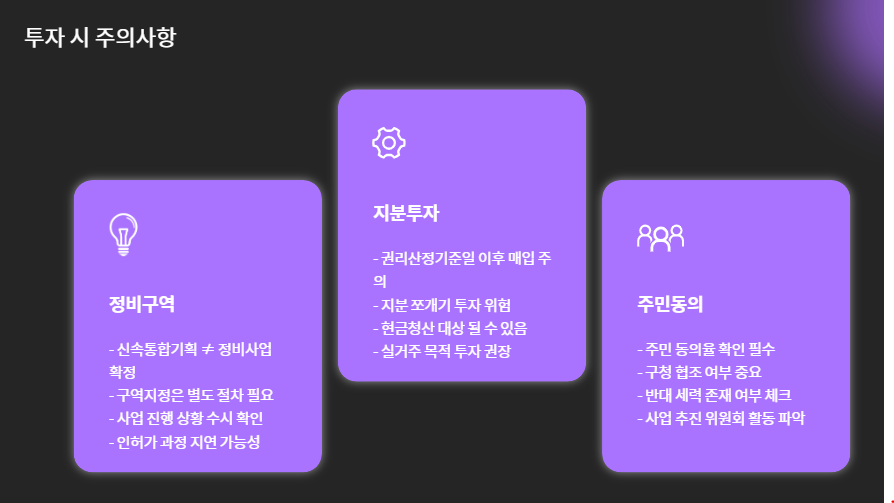 무조건적인 투자보다는 계획 진행 상황, 주민 움직임, 시세 반영 여부 등을 꼼꼼히 점검하는 것이 중요합니다.