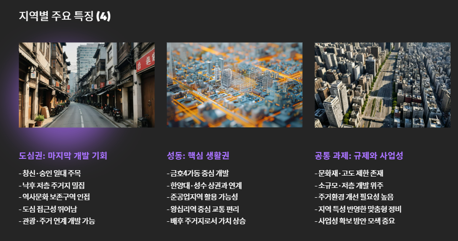 | 종로구 | 창신·숭인 일대 | 낙후 저층 주거지 집중, 역사문화 보호구역 이슈 |