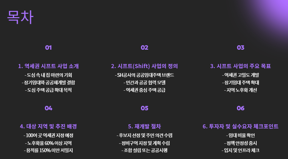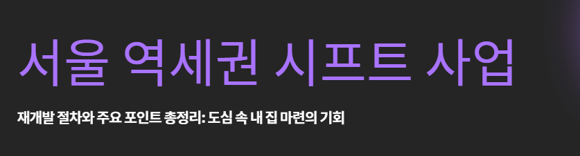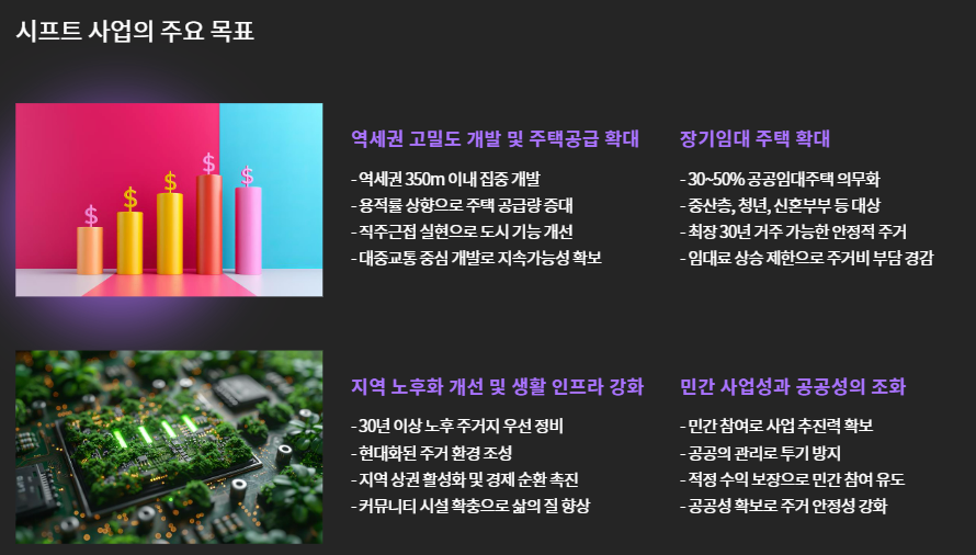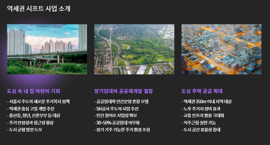 ‘시프트’는 단순한 공공임대사업이 아니라, 장기임대와 공공재개발을 결합한 서울형 주거복지 정책으로, 특히 역세권 고밀개발을 통해 도심 주택 공급을 확대하려는 취지를 담고 있습니다.