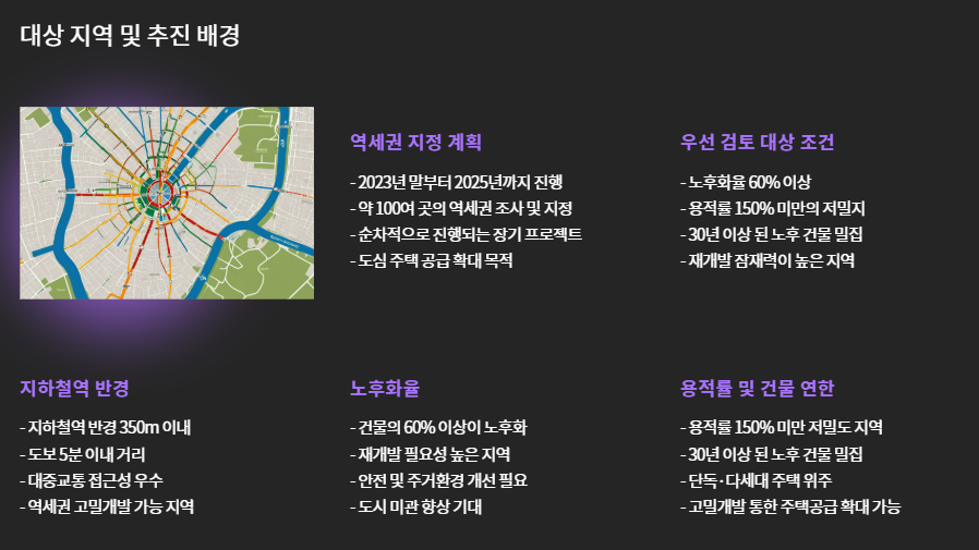 서울시는 2023년 말부터 2025년까지 약 100여 곳의 역세권을 순차적으로 조사 및 지정하고 있습니다.