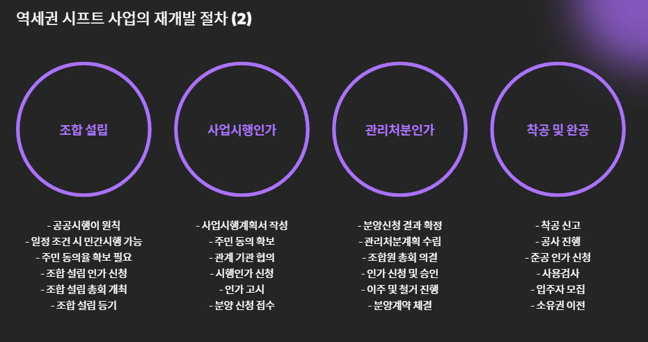 역세권 시프트는 일반 재개발과 유사하지만, 공공성이 추가되며 절차가 약간 달라집니다.