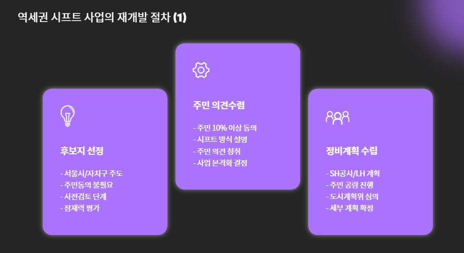 다음은 서울시 기준으로 진행되는 시프트 재개발 절차 요약입니다.